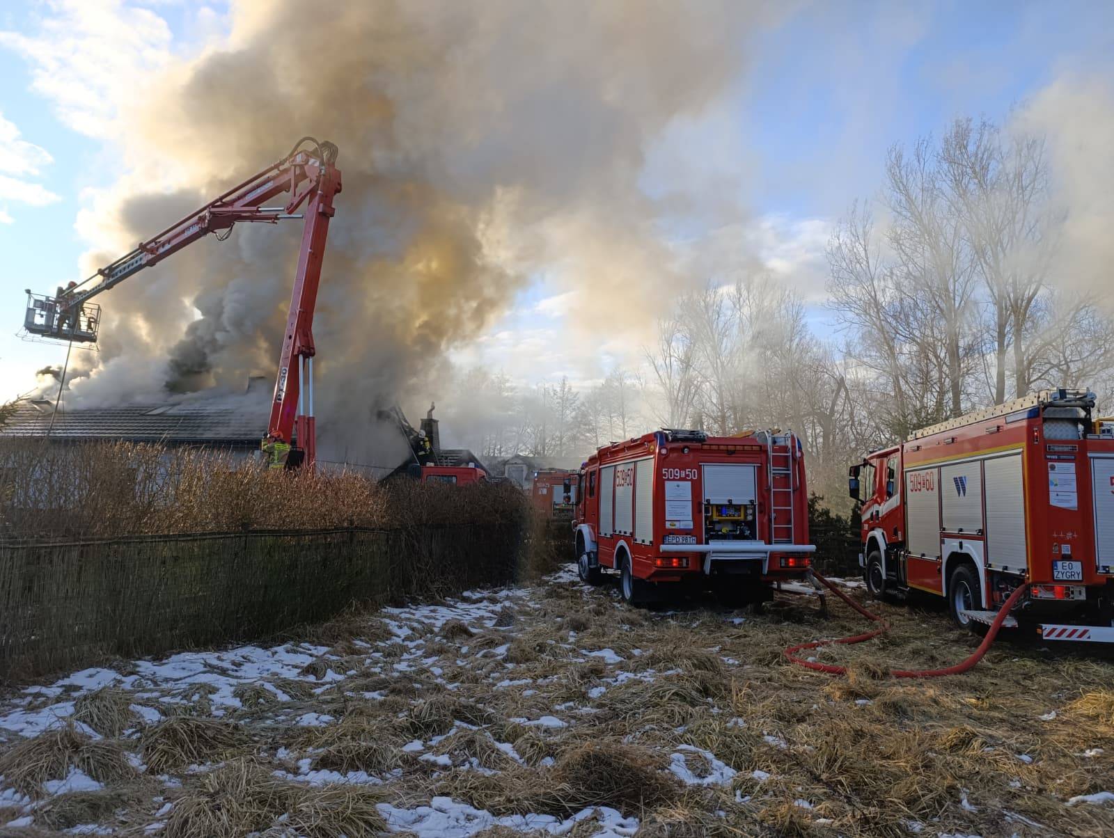 Groźny pożar domu w gminie Poddębice. Ogromne zadymienie i wielogodzinna akcja strażaków [Foto]