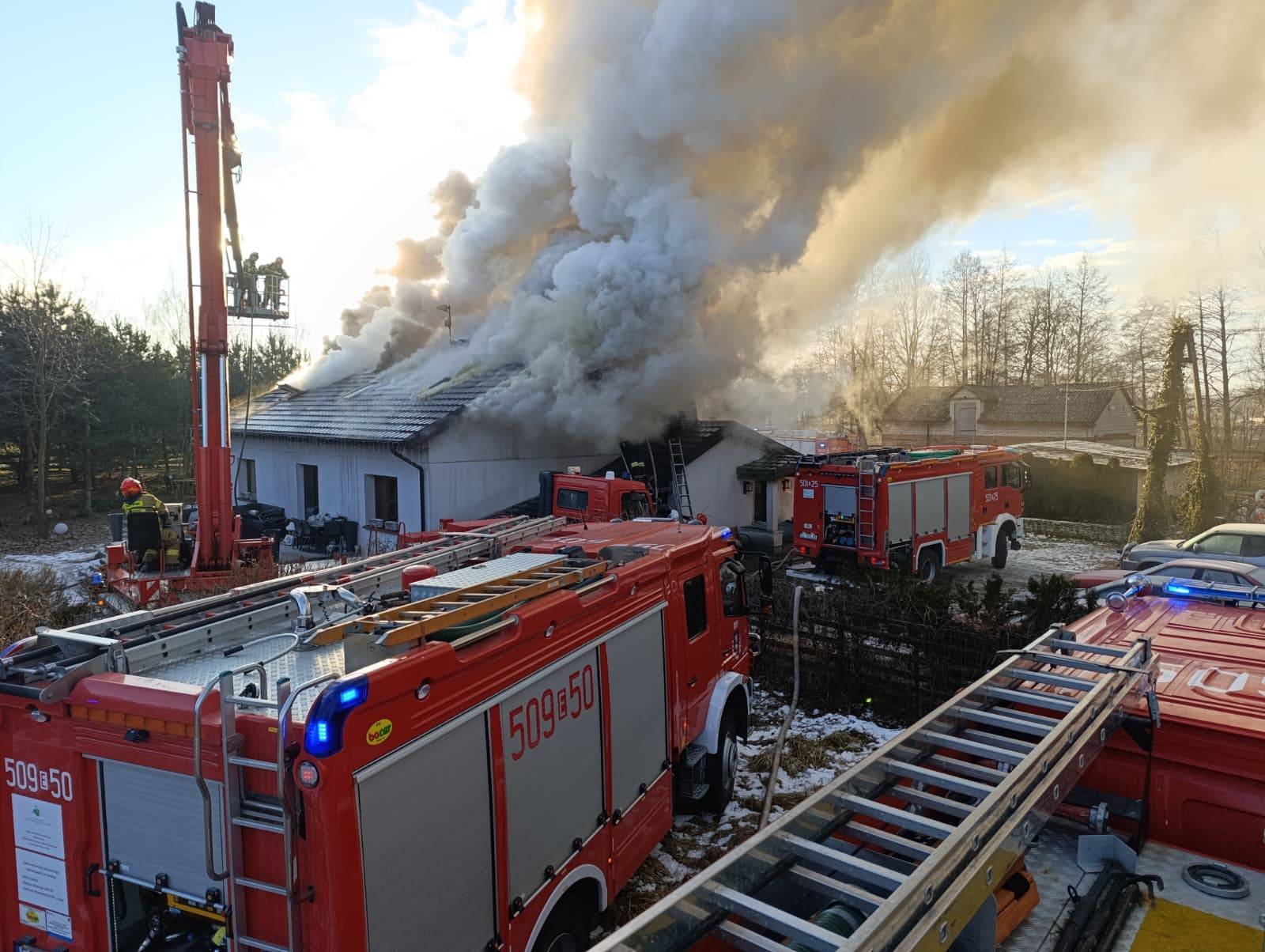 Po dotarciu na miejsce zdarzenia strażacy zastali palący się dach budynku, którego znaczna część była już objęta ogniem. W chwili wybuchu pożaru właściciel domu przebywał poza obiektem.