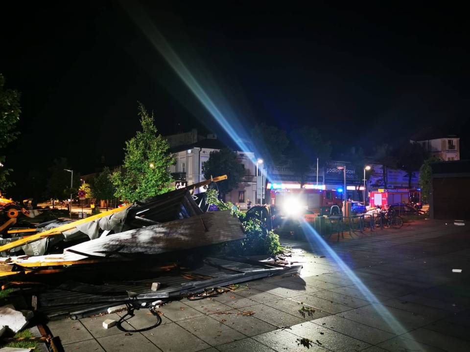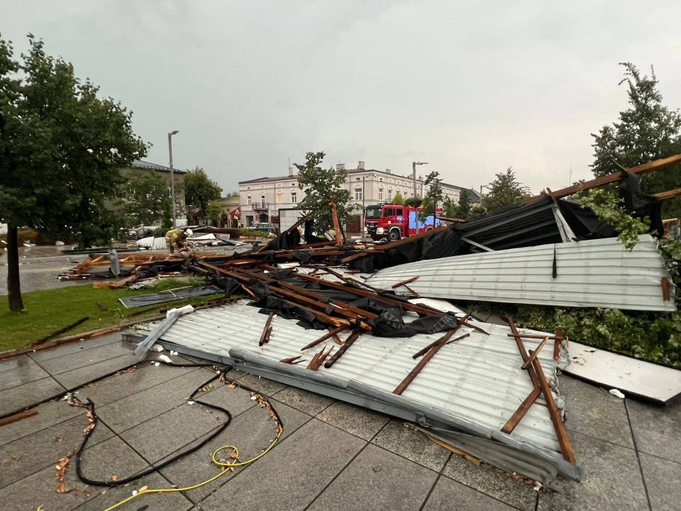 - Zgłoszenia w większości obejmowały powalone drzewa i zerwane linie energetyczne - informują strażacy. - Na Placu Kościuszki w Tomaszowie Mazowieckim z budynku usługowego silny wiatr zerwał około 450 m2 dachu, na którym była zamontowana instalacja fotowoltaiczna. Spadająca konstrukcja uszkodziła m.in. 7 samochodów oraz infrastrukturę placu.