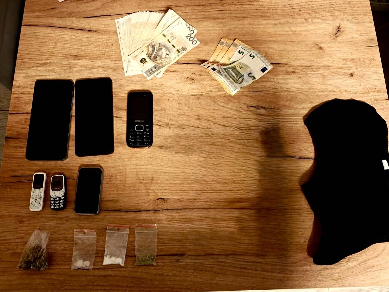 Podczas przeszukań policjanci zabezpieczyli blisko 40 gramów środków odurzających, między innymi marihuanę i mefedron, a także gotówkę. Narkotyki znajdowały się przy dwóch z zatrzymanych. Wszyscy usłyszeli zarzuty kradzieży z włamaniem. Dodatkowo dwóm mężczyznom przedstawiono zarzuty posiadania środków odurzających.