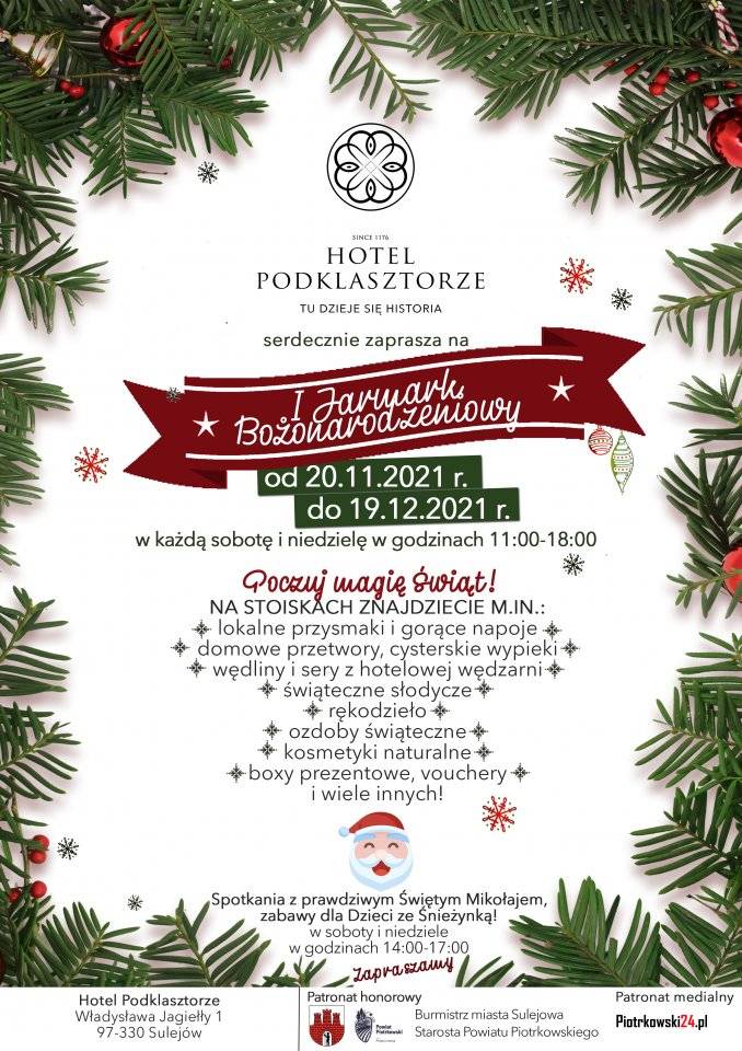 Świąteczną atmosferę czuć tam już niemal wszędzie. W każdą sobotę i niedzielę – aż do 19 grudnia 2021 r. – w Hotelu Podklasztorze w Sulejowie będzie odbywał się jarmark bożonarodzeniowy, podczas którego będzie można poczuć magię świąt. Na stoiskach znajdziecie m.in. domowe przetwory, cysterskie wypieki, świąteczne słodycze i ozdoby, rękodzieło, kosmetyki naturalne i wiele innych świątecznych artykułów. Patronem honorowym tego wydarzenia jest burmistrz Sulejowa – Wojciech Ostrowski.