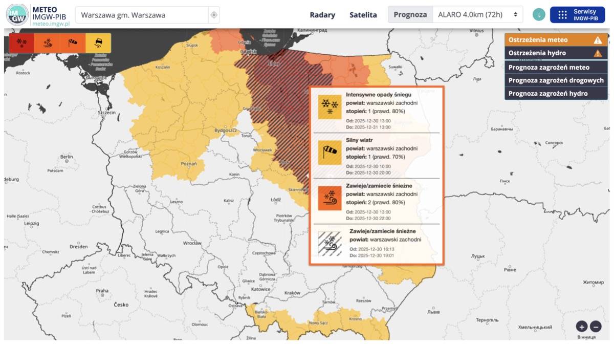 Obecnie w województwie łódzkim – m.in. w powiatach skierniewickim, kutnowskim i rawskim – obowiązuje ostrzeżenie meteorologiczne I stopnia przed silnym wiatrem. Jednocześnie tuż za północną granicą regionu IMGW wydał ostrzeżenie II stopnia przed zawiejami i zamieciami śnieżnymi.