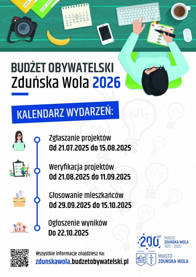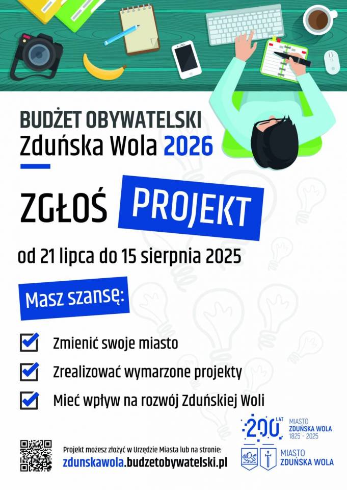 Od poniedziałku, 21 lipca 2025 roku są przyjmowane projekty do Budżetu Obywatelskiego Miasta Zduńska Wola 2026. Mieszkańcy miasta mogą zdecydować o tym na co samorząd ma wydać 1 mln 250 tys. zł. Pula na inwestycje to 1,1 mln zł, a na wydarzenia 150 tys. zł.