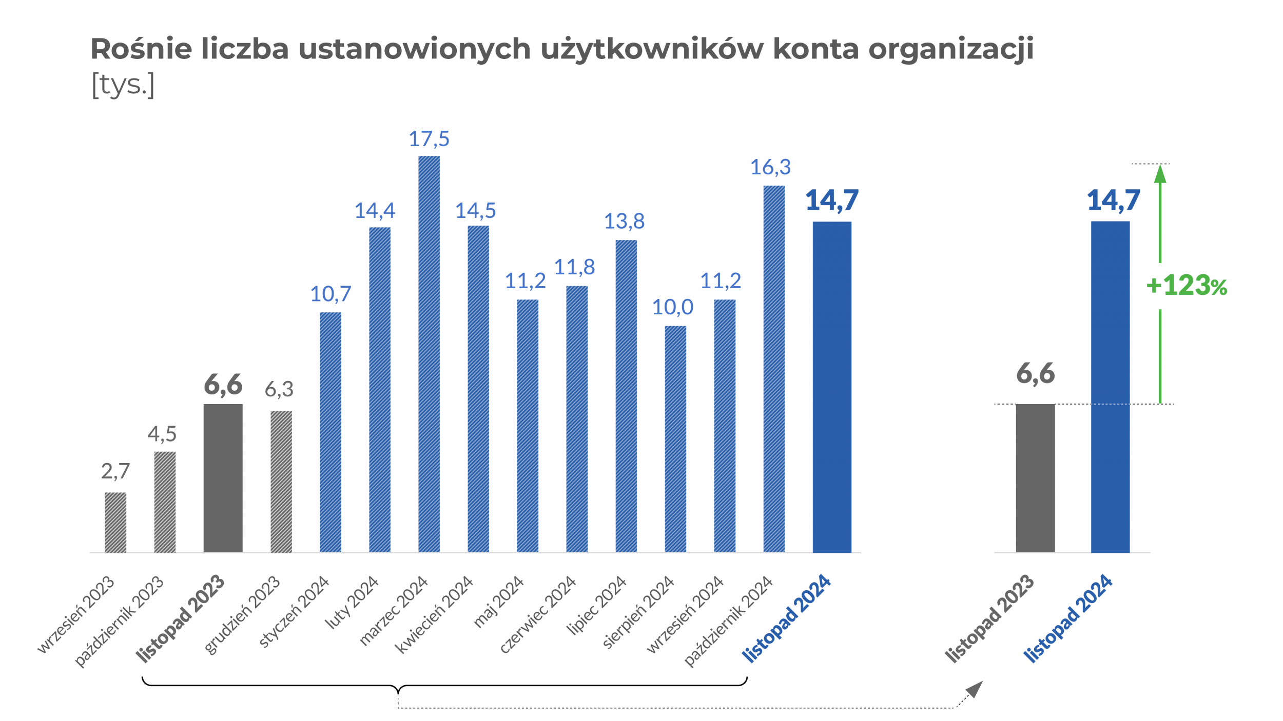 Jak pokazują statystyki Ministerstwa Finansów w styczniu zaczyna się okres zwiększonego zainteresowania nadawaniem uprawnień osobom, które mają te dokumenty złożyć. Na to dodatkowo nakłada się stale rosnące zainteresowanie usługą konta organizacji. Na przykład w listopadzie 2023 r. organizacje zawnioskowały o dostęp dla 6,6 tys. osób, a w listopadzie 2024 r. było to już 14,7 tys. To oznacza ponad dwukrotny wzrost.